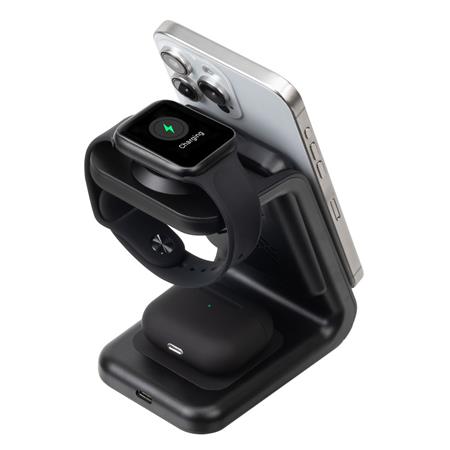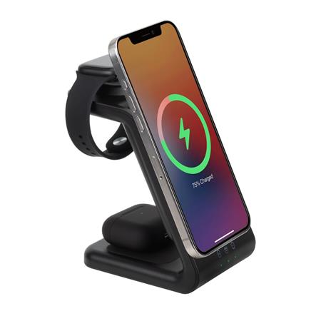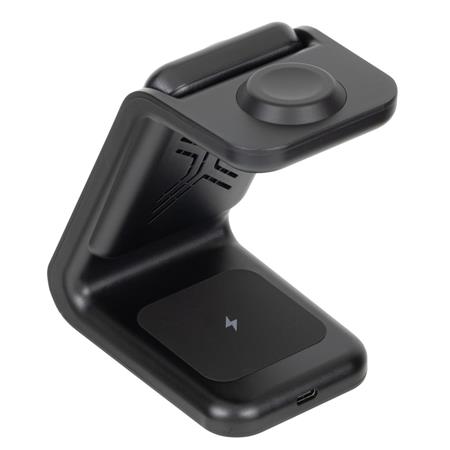 3 az 1-ben ezeték nélküli töltőállomás levehető hordozható akkumulátorral. Lehetővé teszi iPhone, Apple Watch és Pods egyidejű vezeték nélküli töltését.